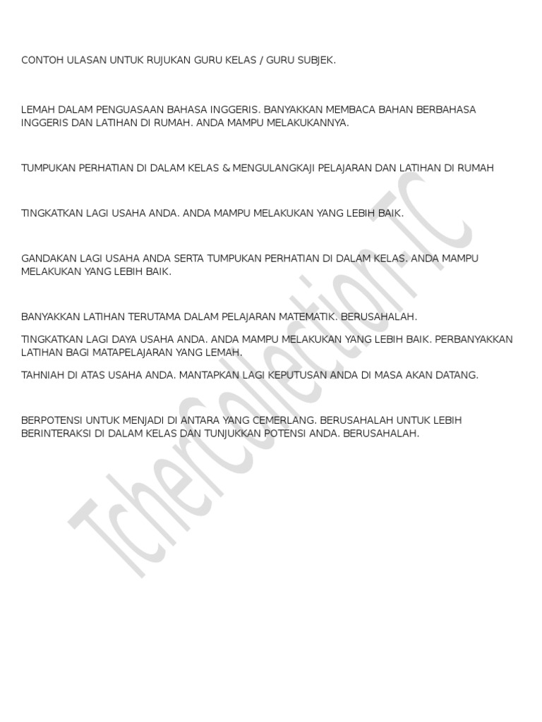 Setiap murid hendaklah mengingati lima langkah asas sebelum melintas jalan. Berikut ini beberapa contoh teks ulasan tersebut. Contoh ulasan untuk rujukan guru kelas guru subjek.